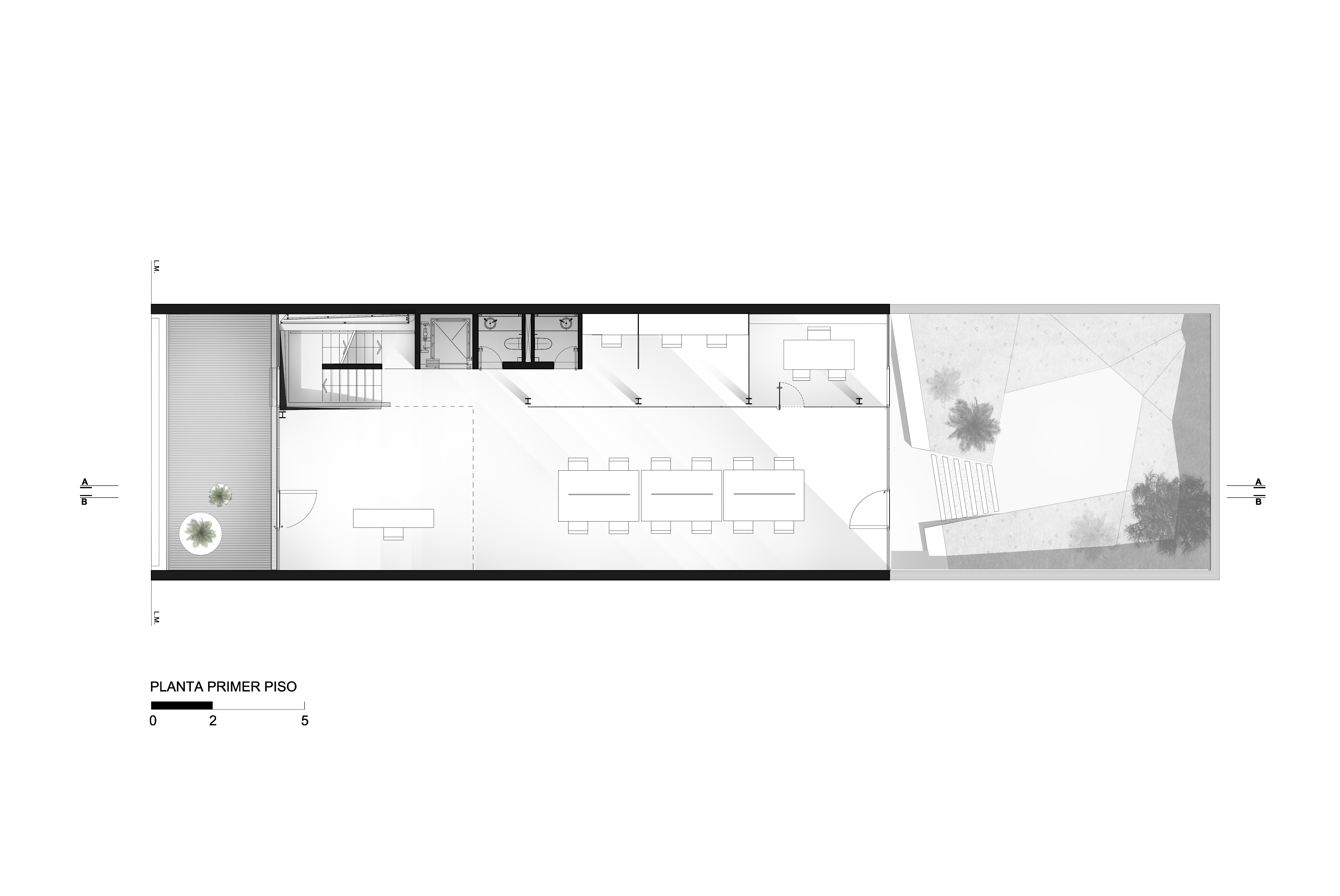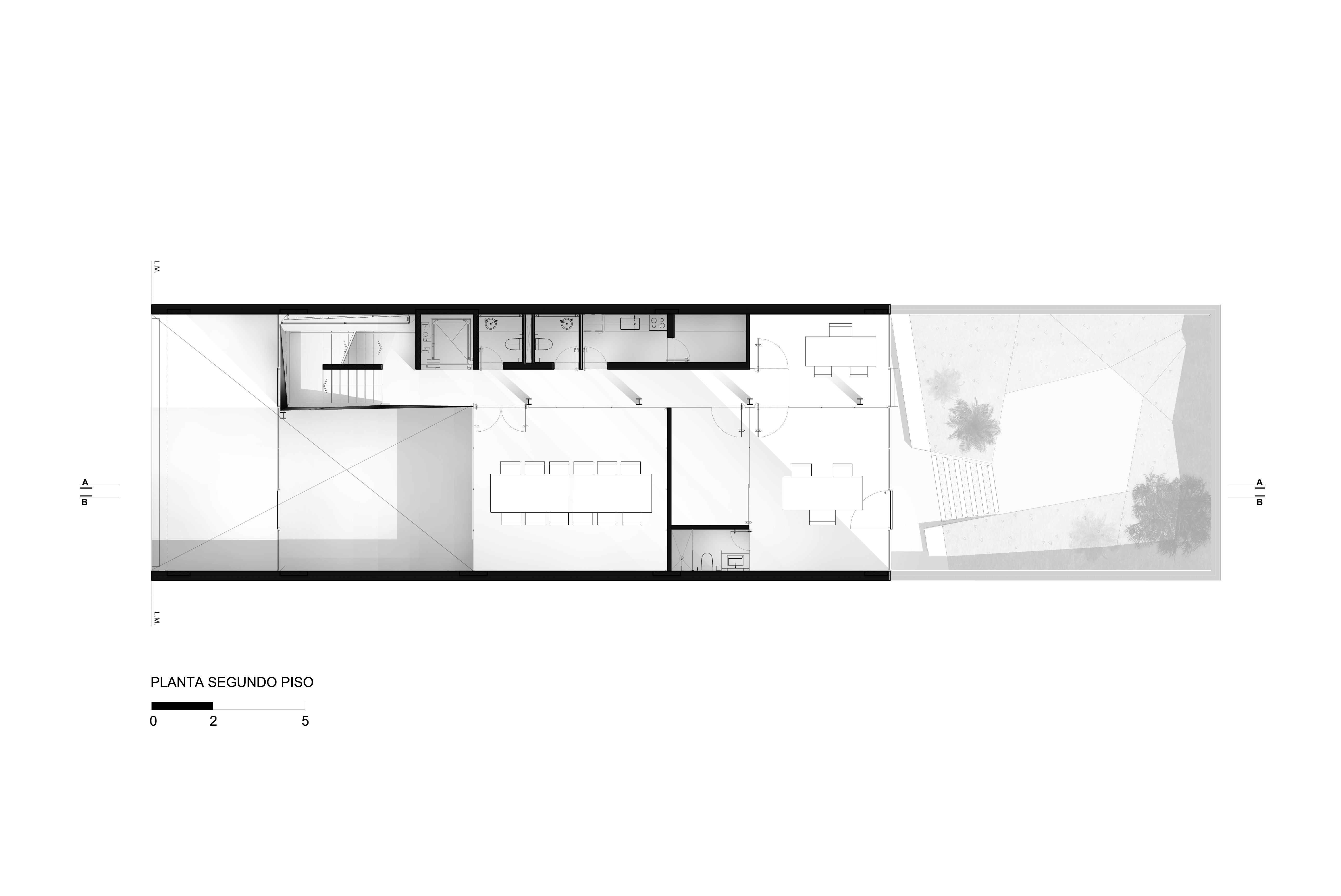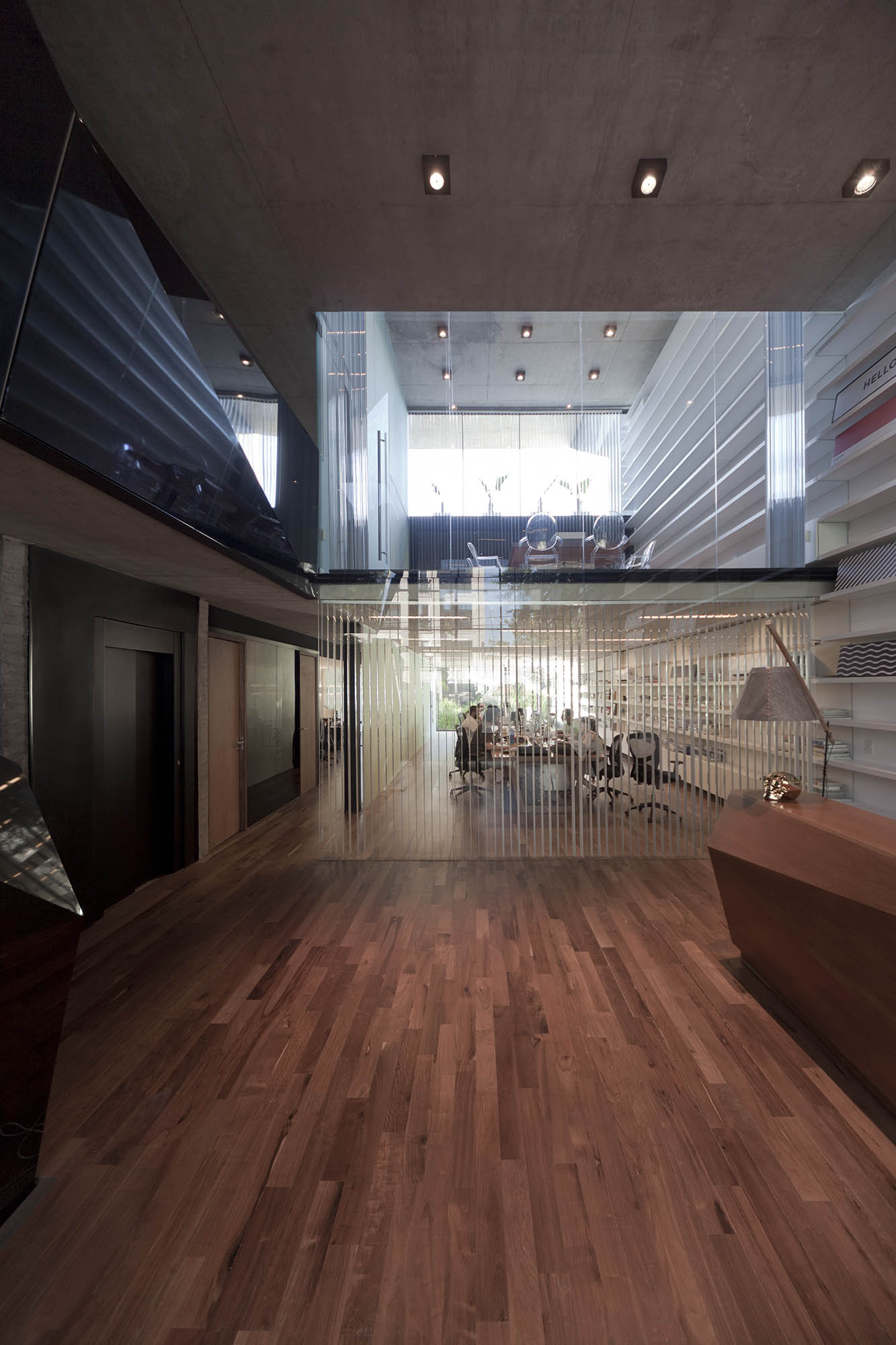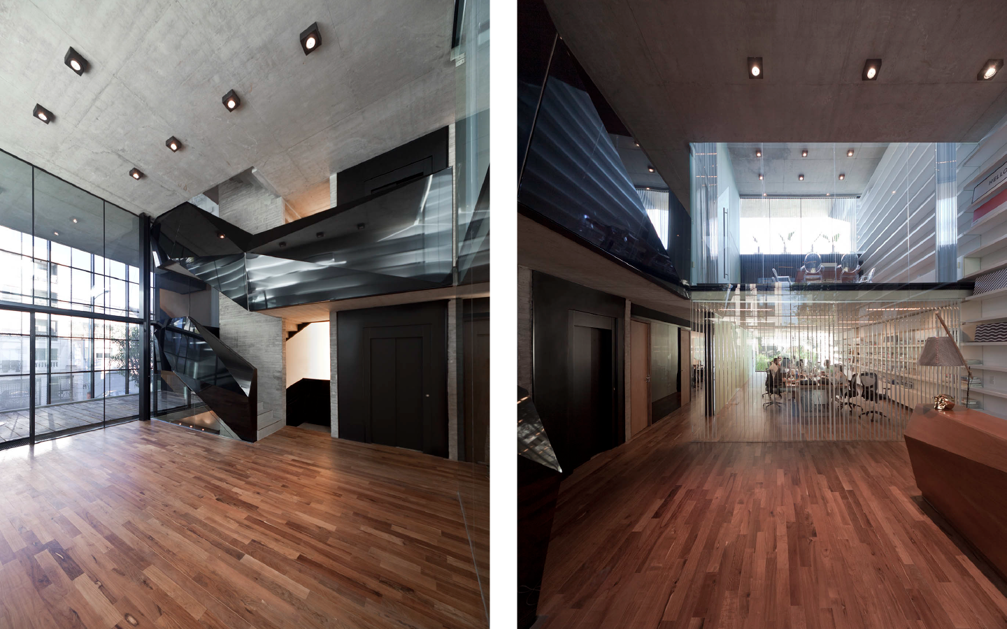 Se propone una serie de espacios de mayor altura que se vinculan entre sí en el corte del proyecto. A través de estos vacios, los espacios de trabajo comienzan a relacionarse visualmente entre si, a recibir luz desde diferentes orientaciones y tener vistas inesperadas: desde la recepción del primer piso puede verse el cielo hacia el norte, desde la terraza que abre al contrafrente puede verse también la vereda que está varios pisos mas abajo. Esta simple operación en el corte del edificio que recrea algunos experimentos artísticos -desde las intervenciones de Gordon Matta Clark a las ilustraciones de Tadonori Yokoo de las esquinas en Y de Tokio- incorpora dinamismo y sorpresa al espacio interior.