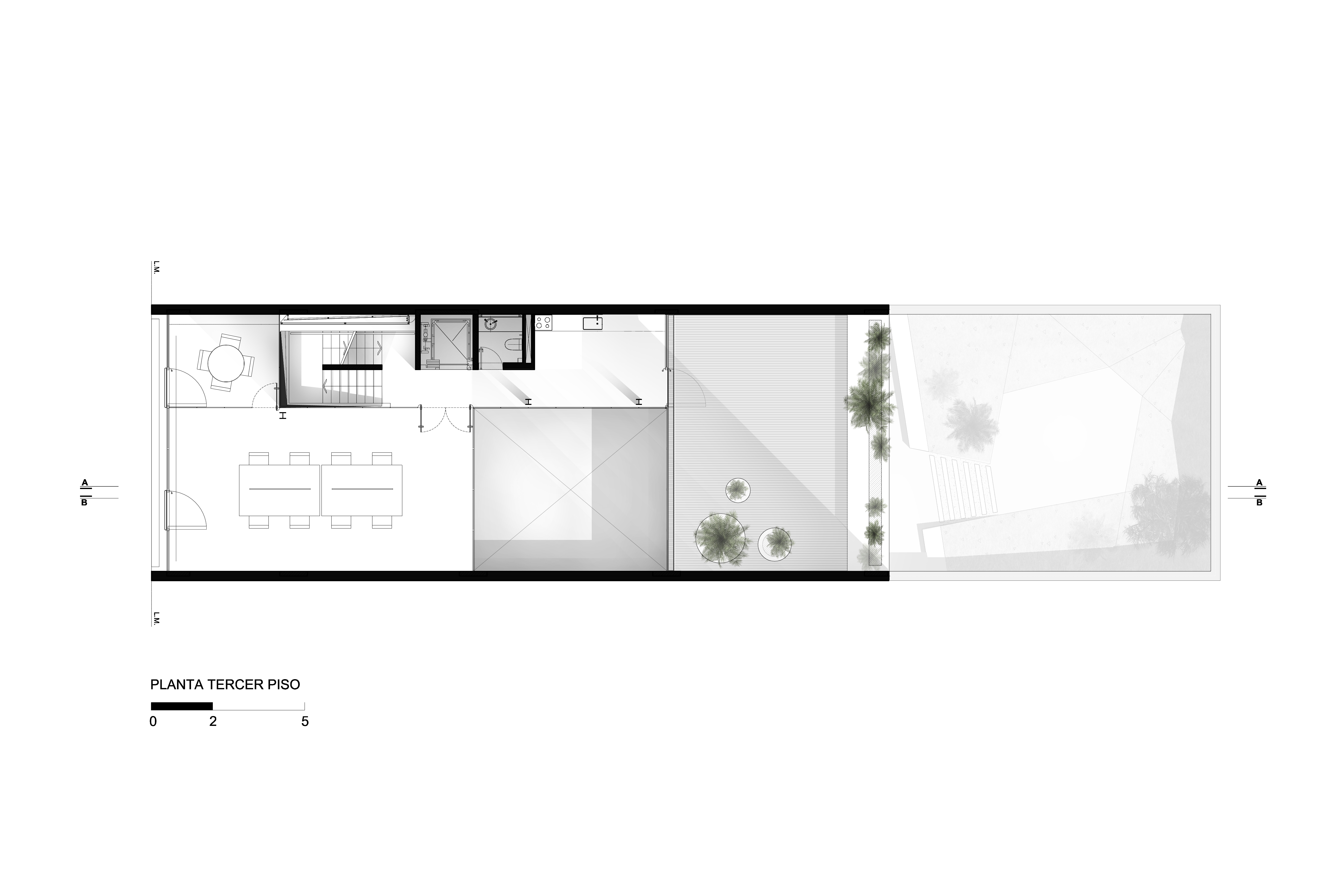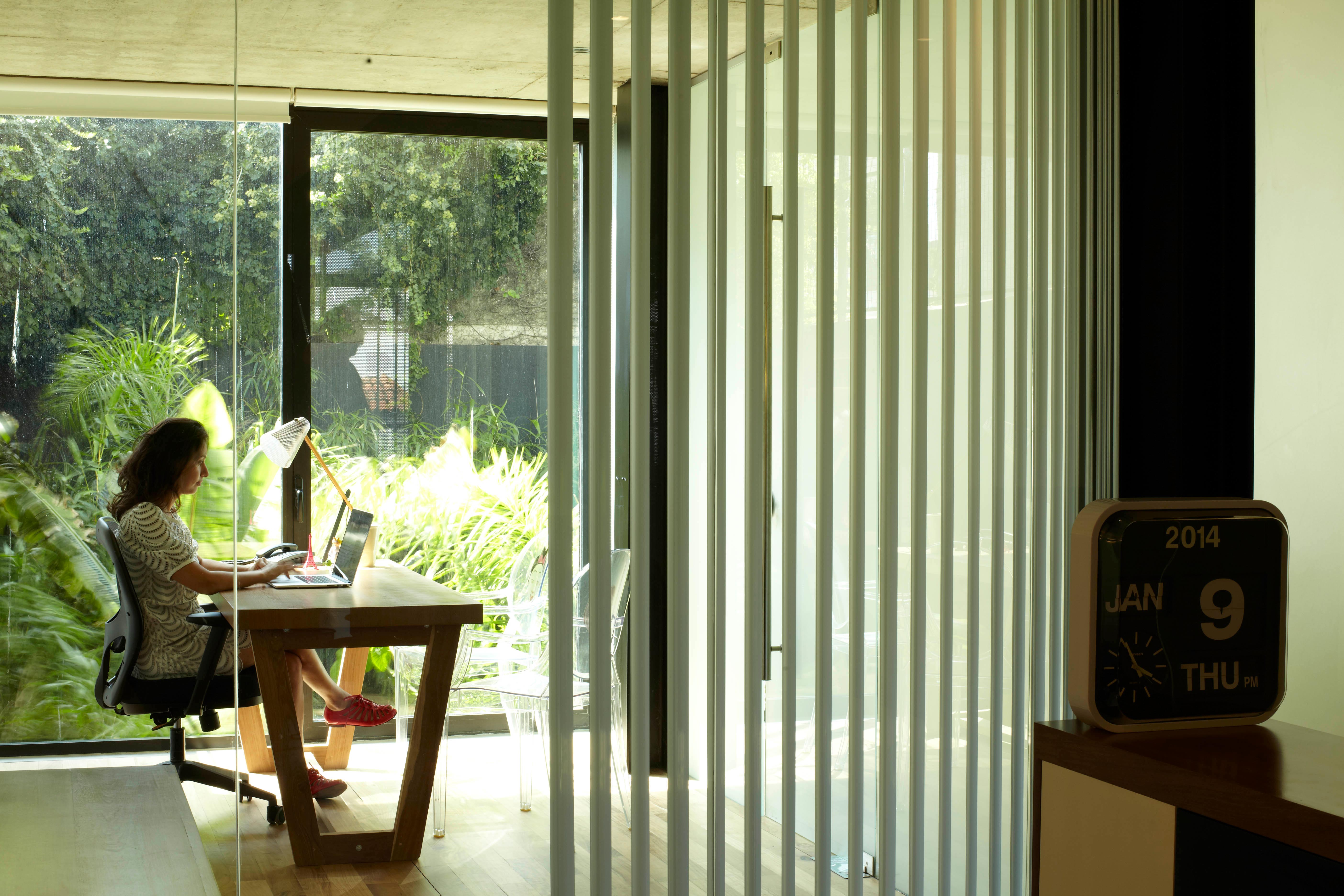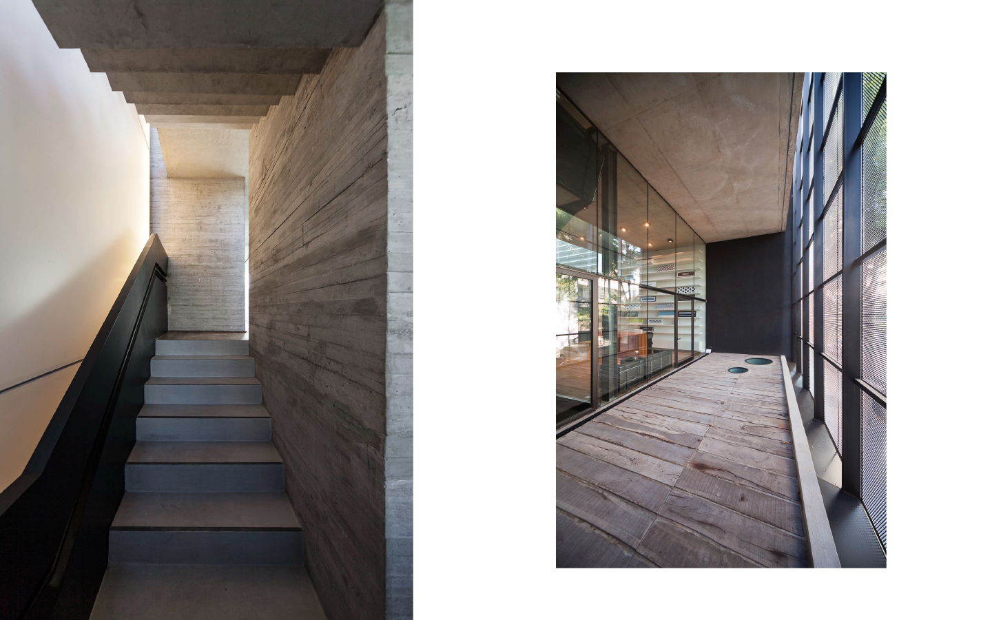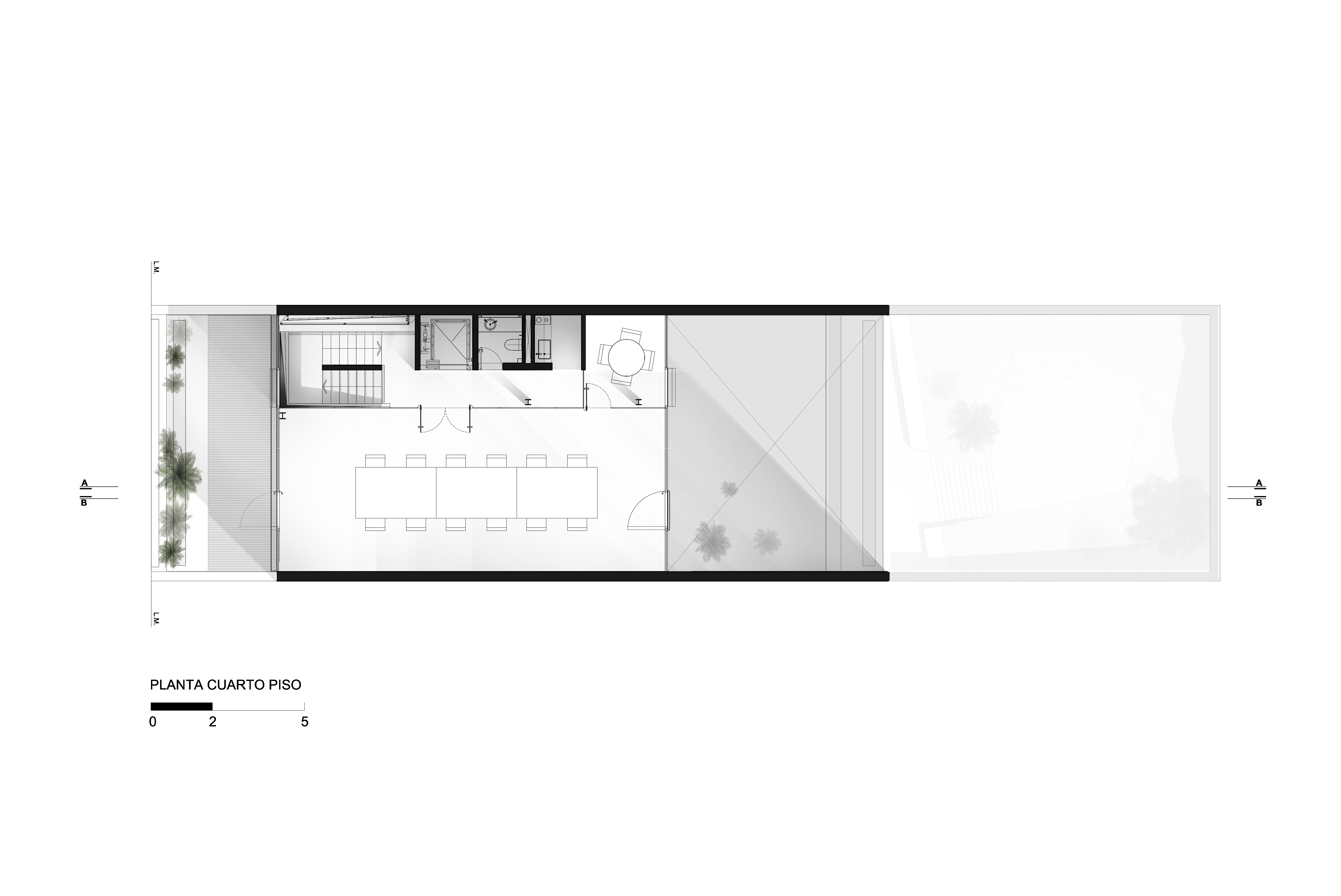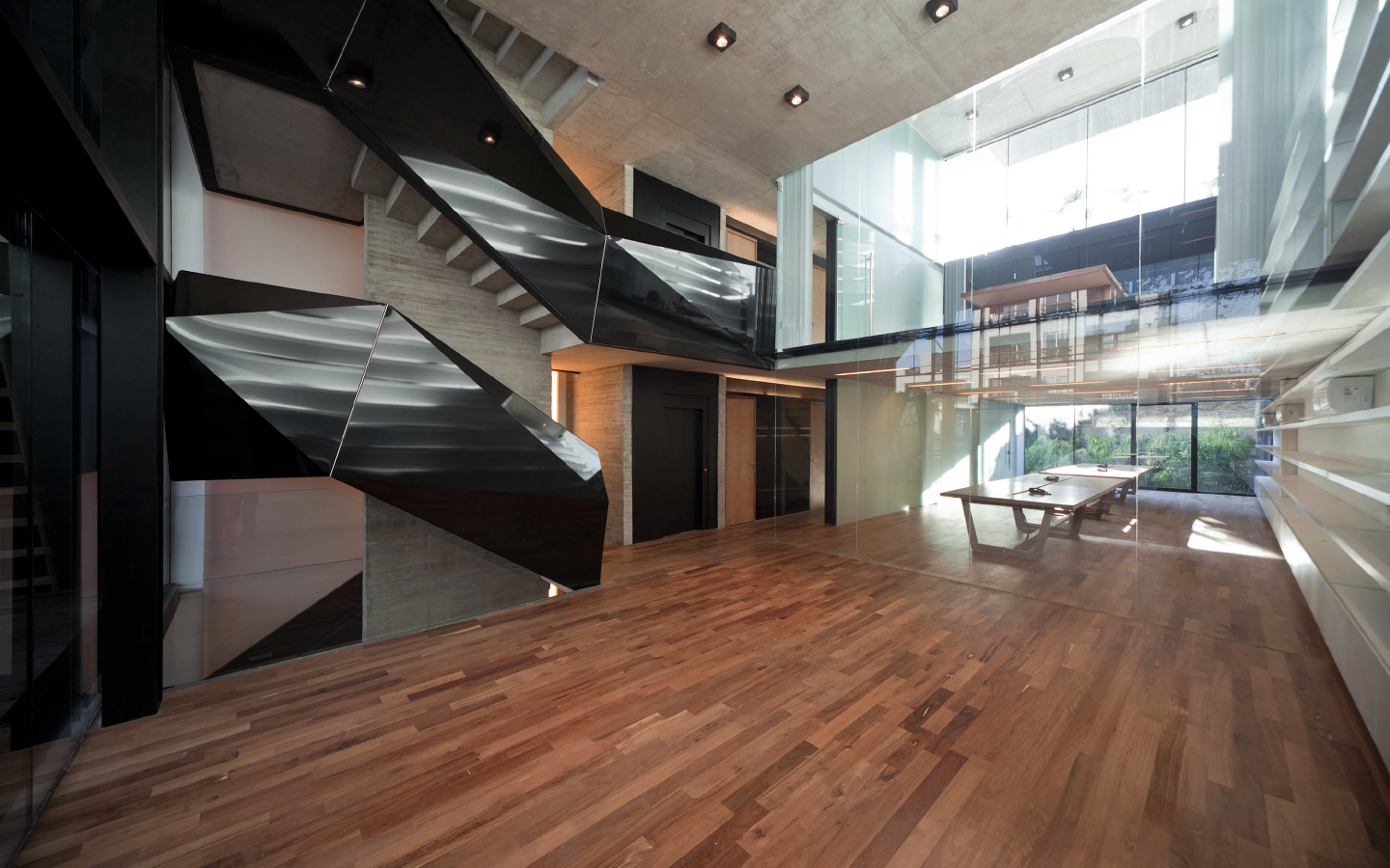 Se propone una serie de espacios de mayor altura que se vinculan entre sí en el corte del proyecto. A través de estos vacios, los espacios de trabajo comienzan a relacionarse visualmente entre si, a recibir luz desde diferentes orientaciones y tener vistas inesperadas: desde la recepción del primer piso puede verse el cielo hacia el norte, desde la terraza que abre al contrafrente puede verse también la vereda que está varios pisos mas abajo. Esta simple operación en el corte del edificio que recrea algunos experimentos artísticos -desde las intervenciones de Gordon Matta Clark a las ilustraciones de Tadonori Yokoo de las esquinas en Y de Tokio- incorpora dinamismo y sorpresa al espacio interior.