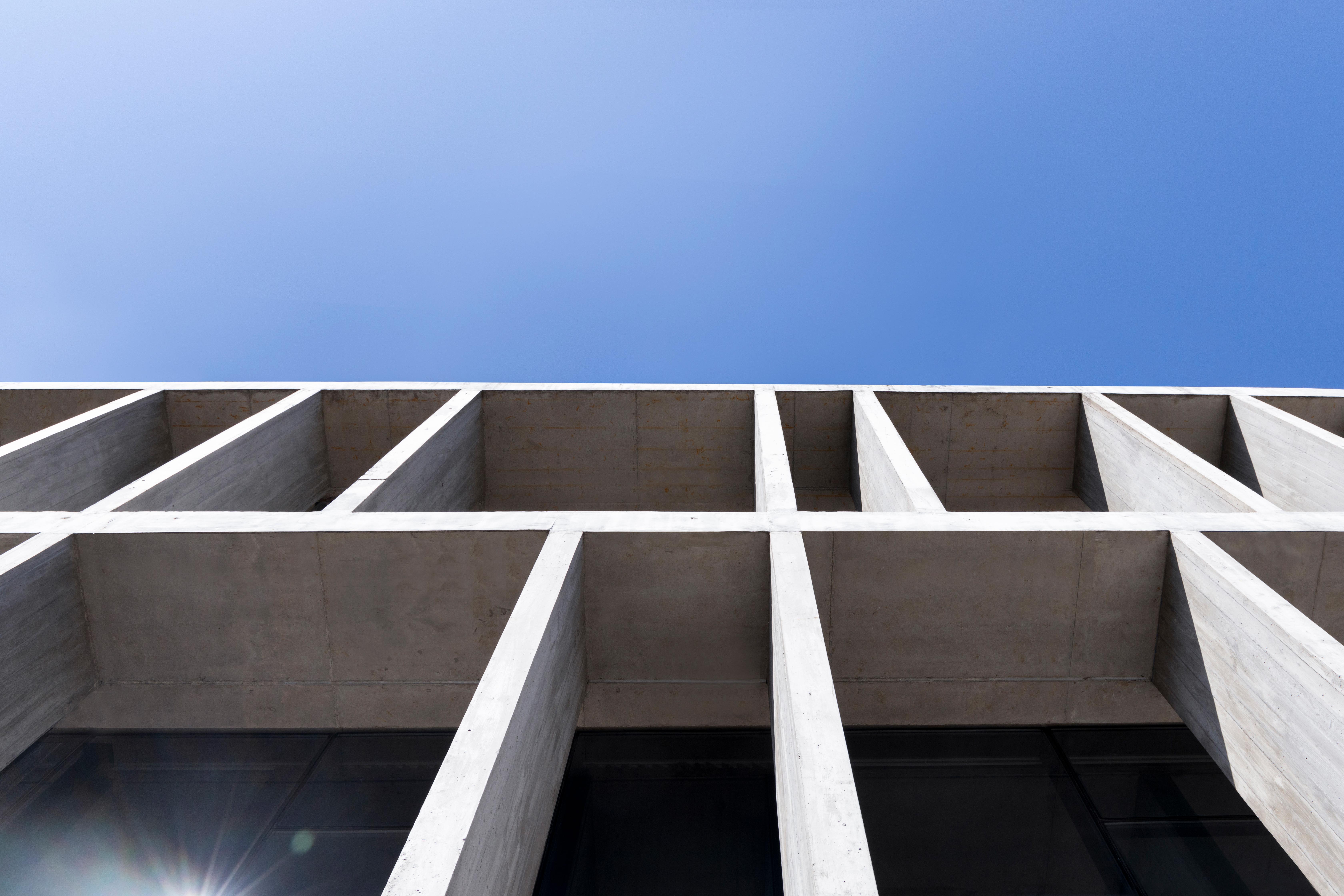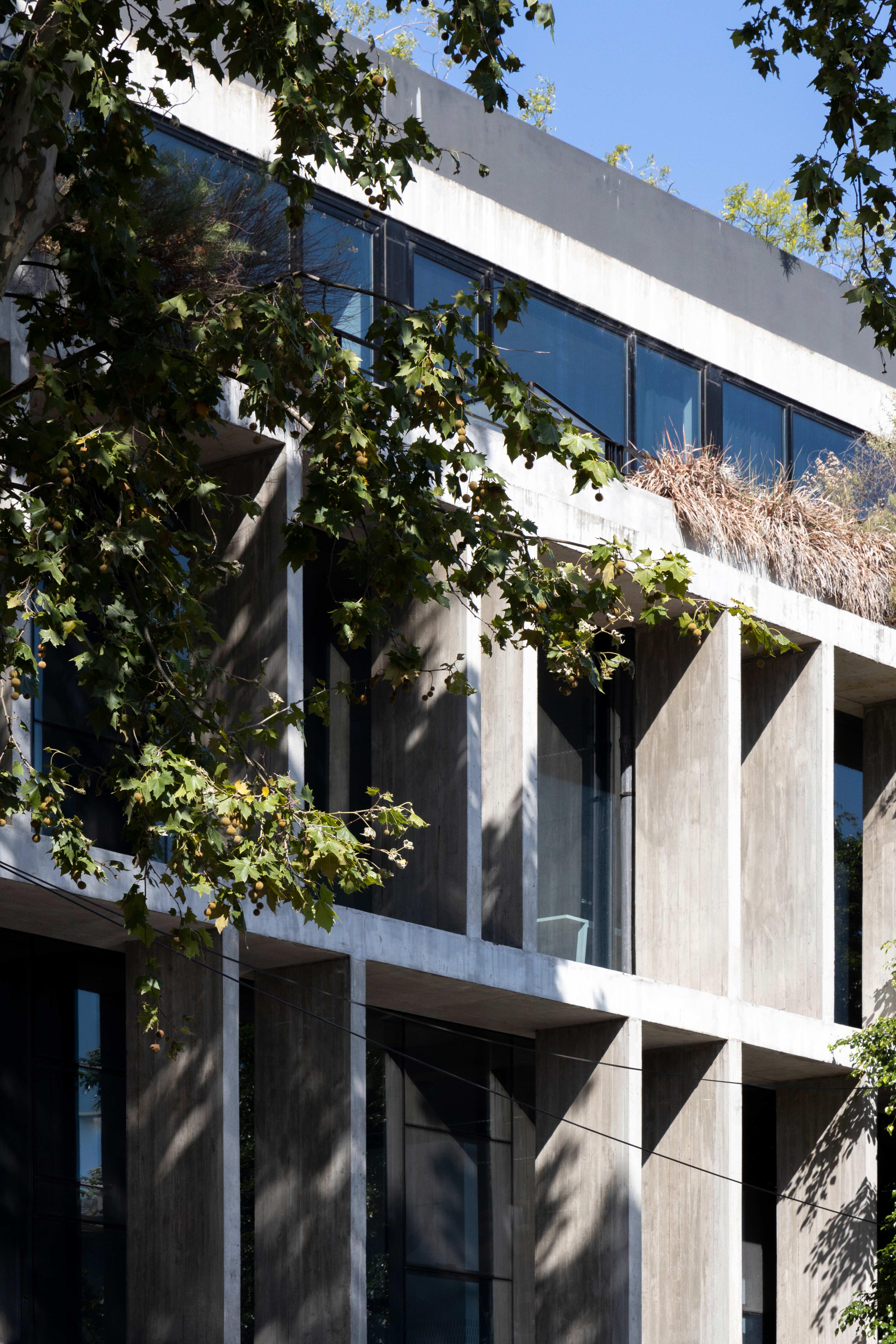 Los elementos de hormigón de las fachadas dan un carácter distintivo al edificio y funcionan simultáneamente como estructura y como protección solar de los planos vidriados.