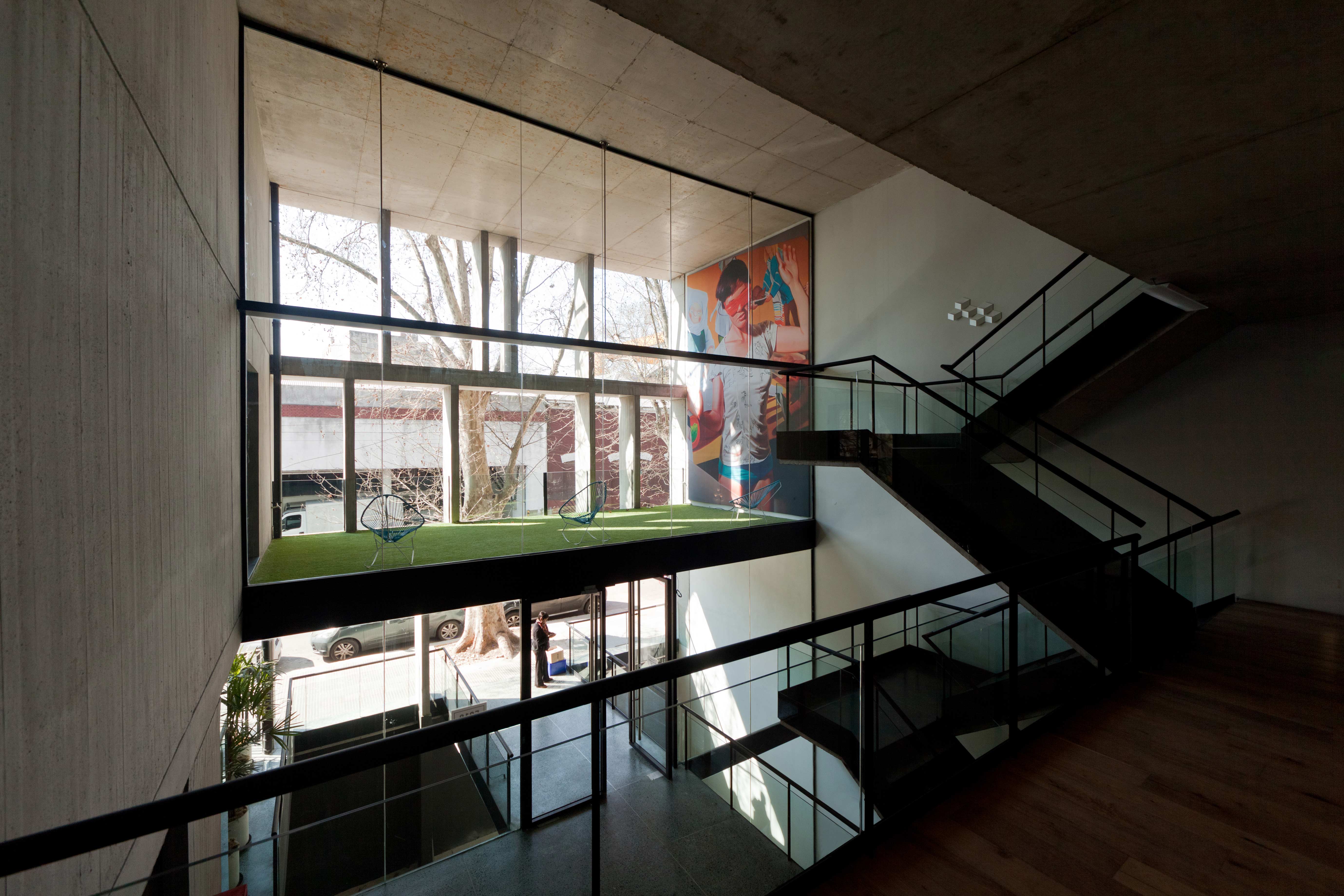 En el sector menos profundo del terreno, se ubica un hall con múltiples alturas, ascensores y escaleras abiertas Una serie de vacíos se vinculan entre sí, llegando hasta el subsuelo y permitiendo la comunicación visual entre los distintos niveles. A través de una lucarna lineal que permite la entrada de luz cenital, la medianera del fondo se baña de luz y funciona como telón de fondo de este juego de losas y escaleras.