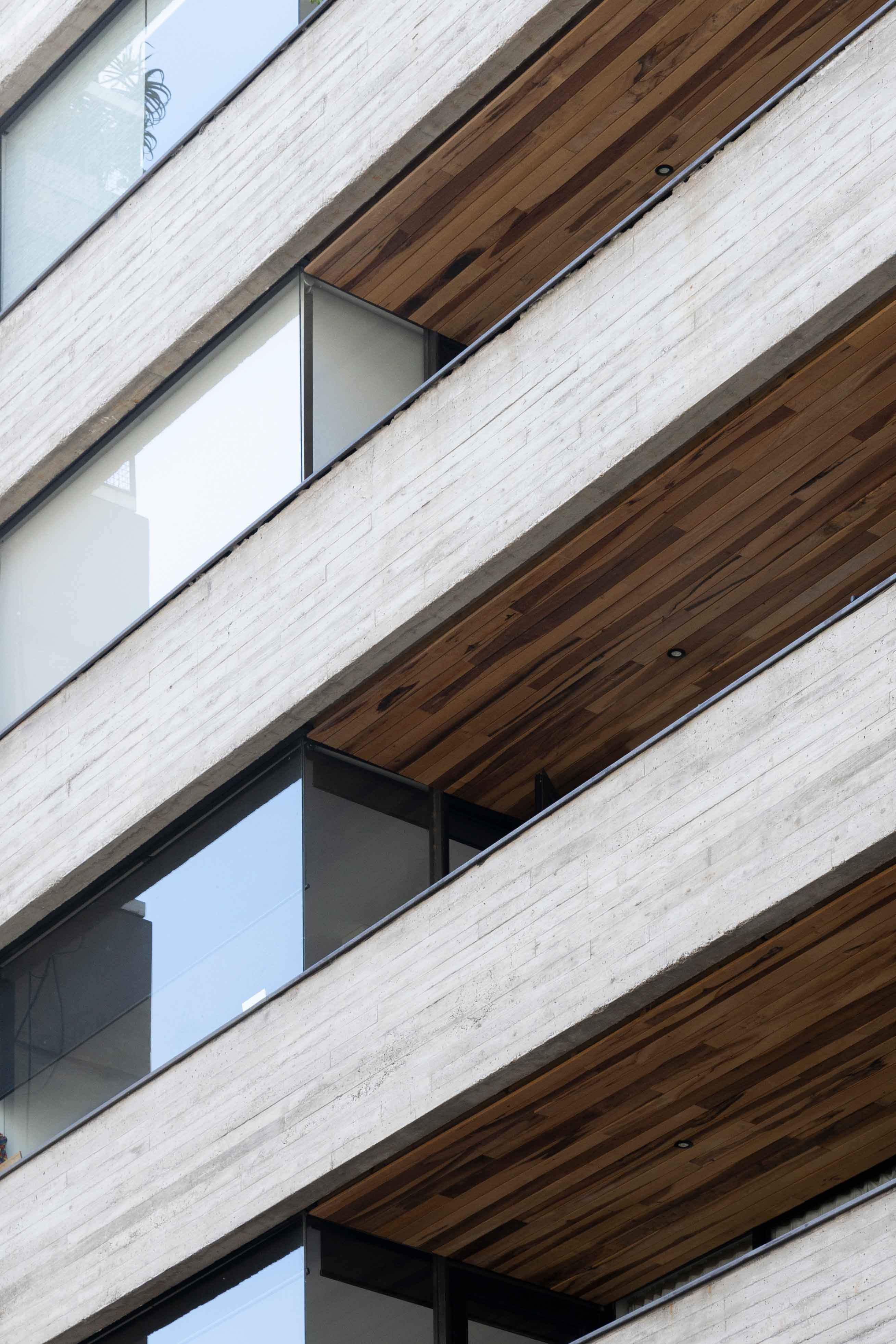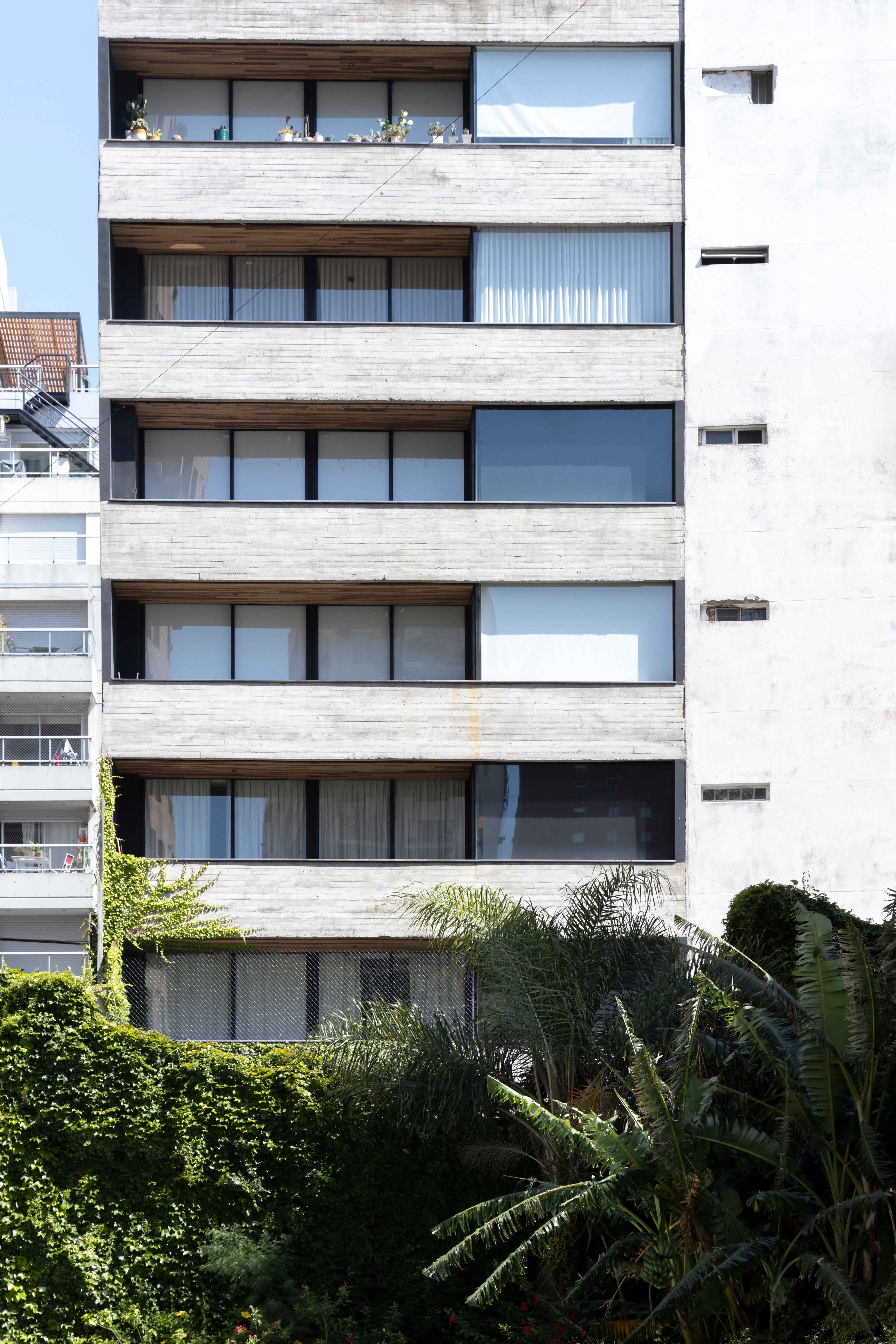 La fachada, una composición moderna de hormigón visto, proyecta solidez y permeabilidad a la vez. Amplias aperturas permiten el ingreso generoso de luz natural, mientras que el diseño regula cuidadosamente la relación entre transparencia y privacidad. Un sistema de bandas horizontales en el hormigón confiere elegancia y esbeltez al edificio, generando una lectura rítmica que suaviza la materialidad bruta del concreto y le otorga una presencia liviana y refinada.