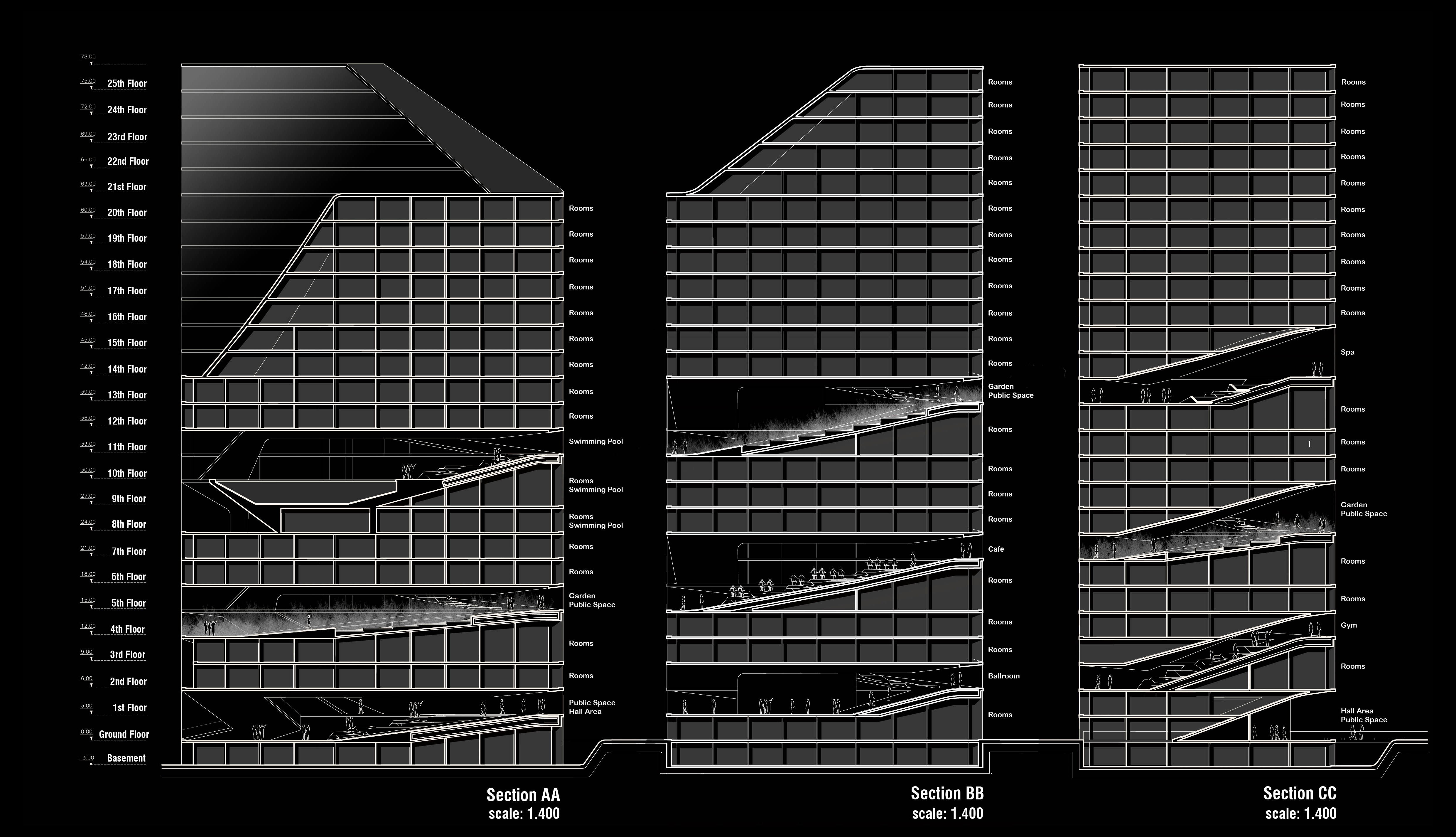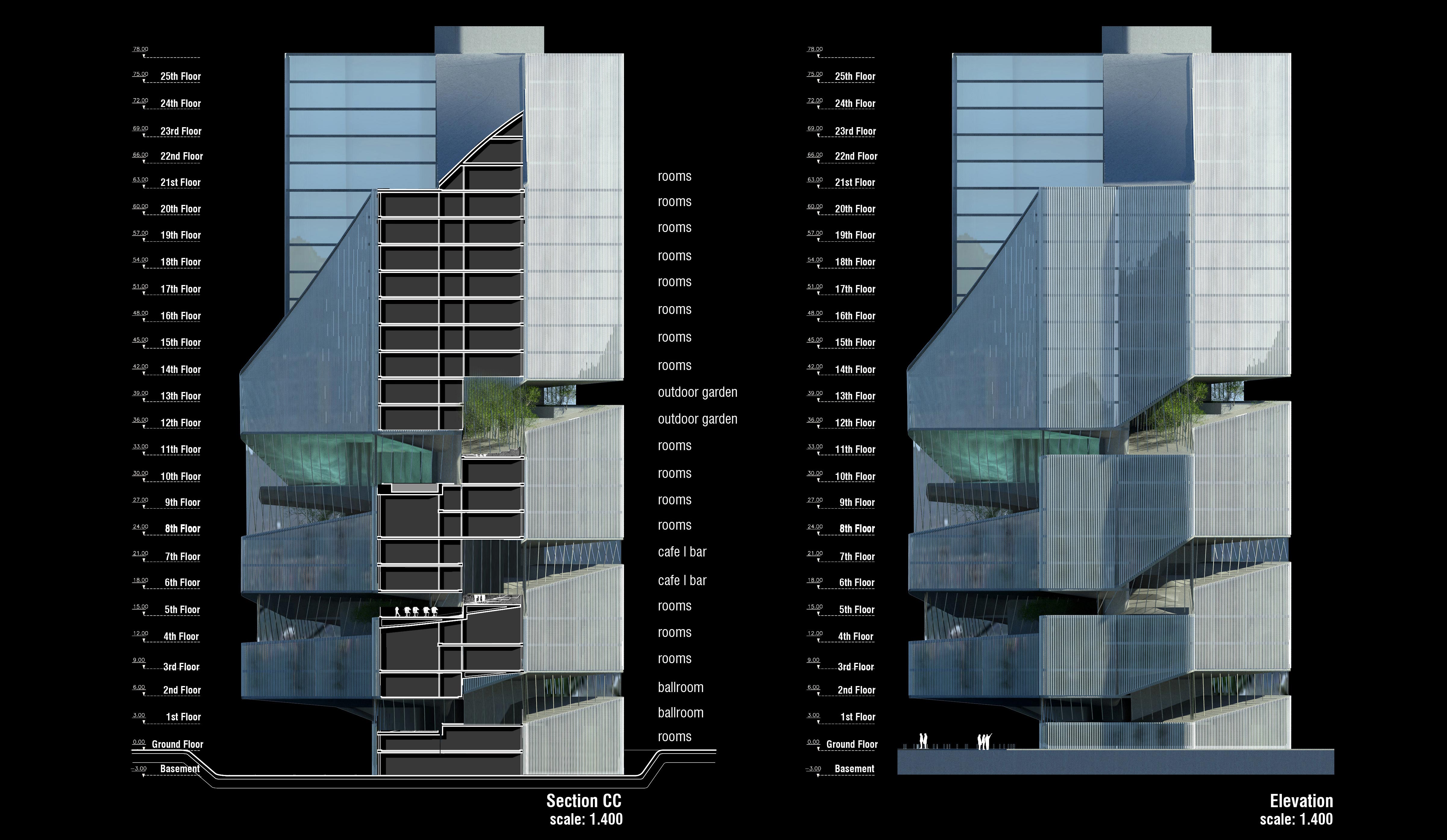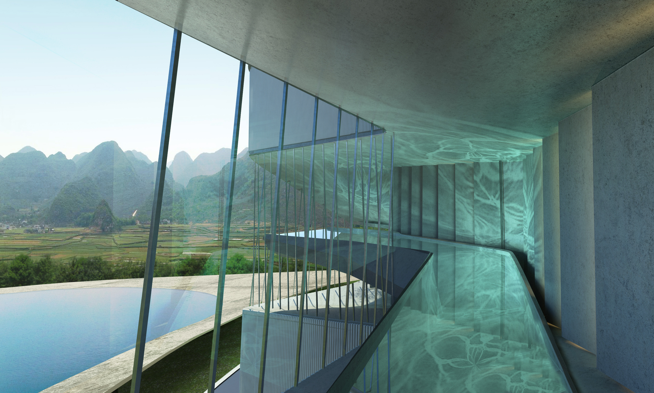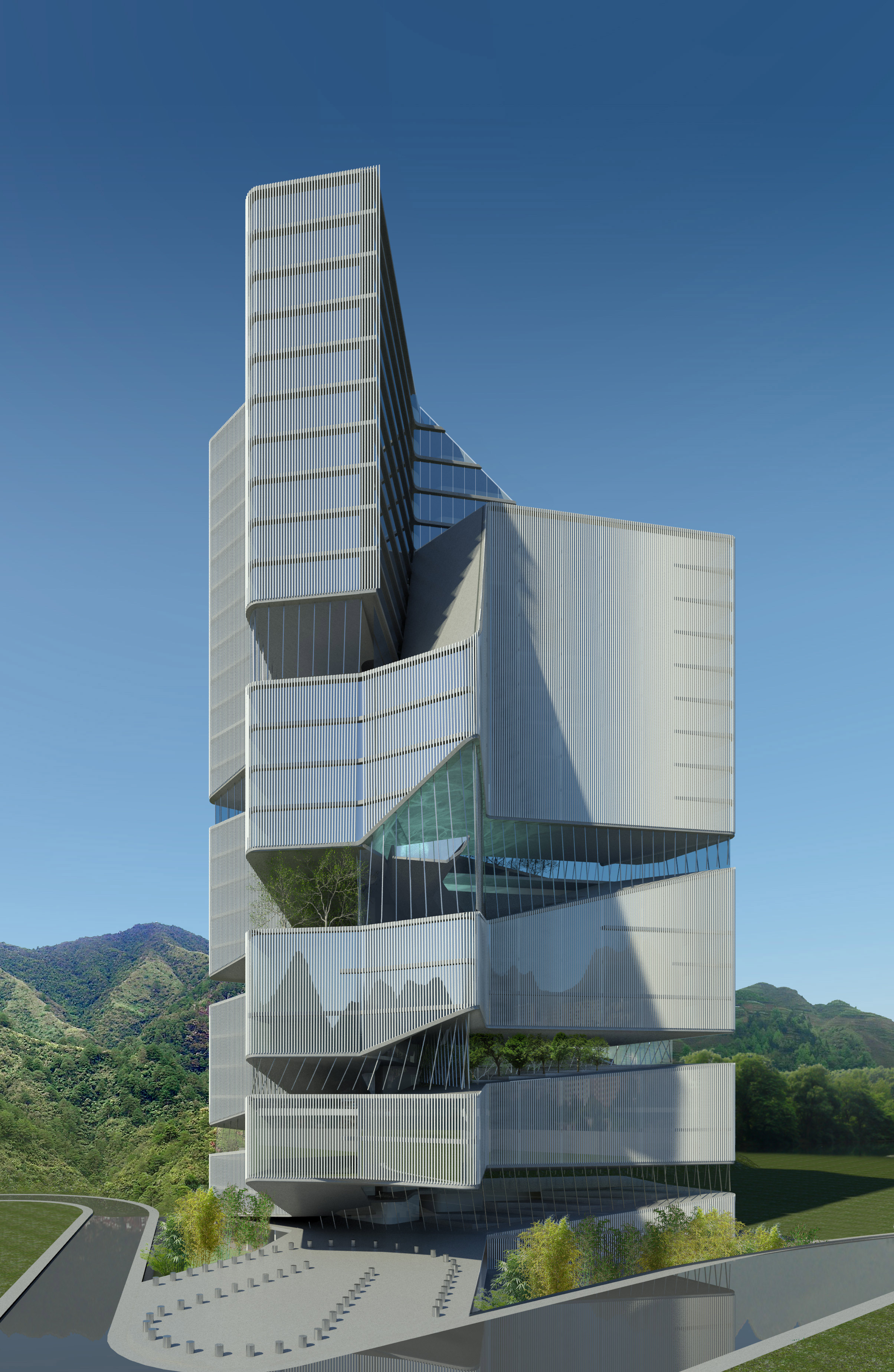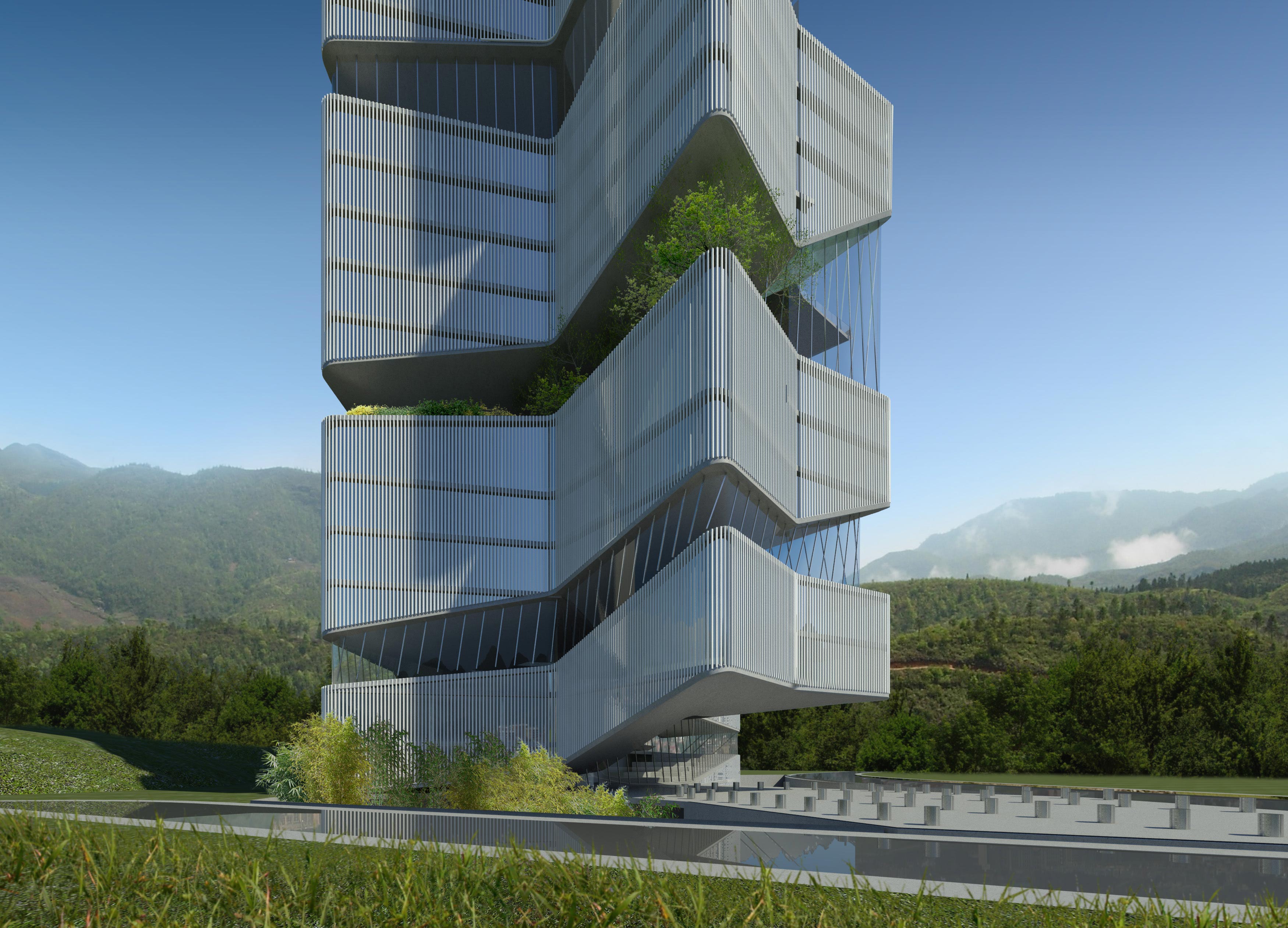 El edificio de viviendas con servicios de hotel, parte del estudio de la topografía de la provincia y de las terrazas para cultivo de arroz que se extienden por toda la región. Las terrazas nos interesaron por varios motivos: geométricamente son el resultado formalmente complejo de una regla de extrema simplicidad: unir todos los puntos que estén a igual altura. Conceptualmente contienen elementos naturales, pero son producto de una operación de construcción, son simultáneamente naturaleza y artificio.
