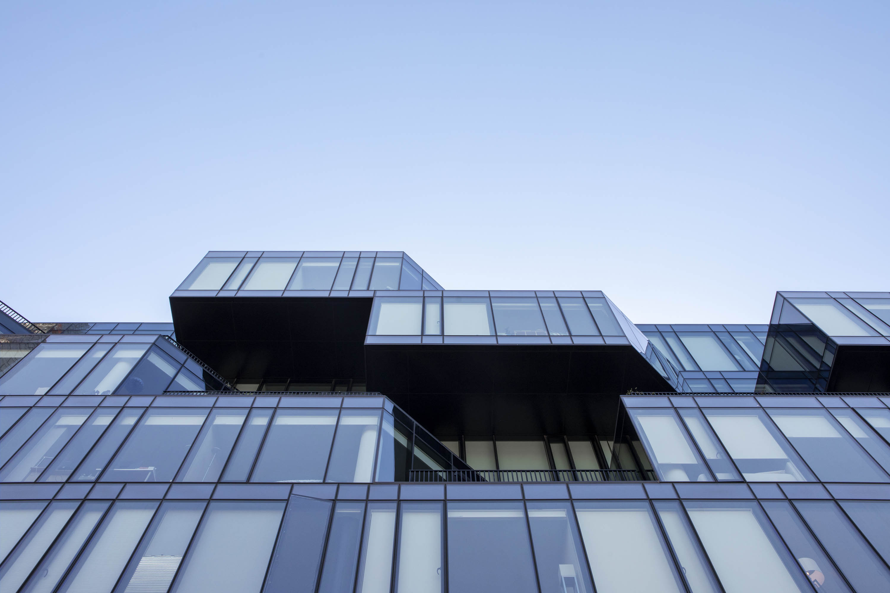 En los pisos más bajos la fachada del edificio se encuentra sobre la línea de propiedad, generando la sensación de un volumen sólido. A medida que se asciende, la fachada se va horadando y volviéndose porosa, y el volumen solido de los pisos inferiores va transformándose en una serie de espacios intermedios entre interior y exterior. Estas terrazas proponen una articulación entre el espacio público de la calle y la intimidad del espacio de los departamentos.